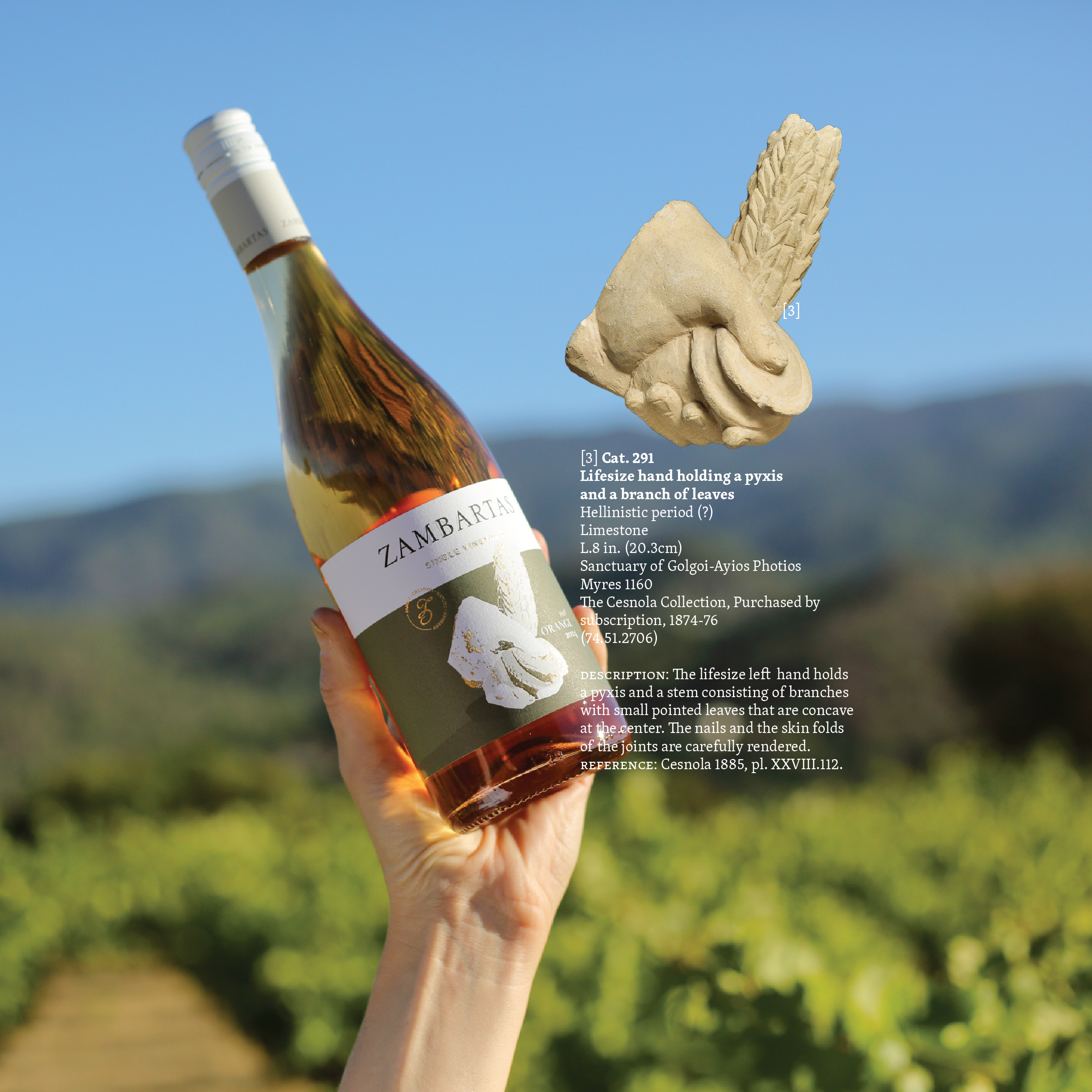 The labels of the Single Vineyard Range, designed for Zambartas winery are inspired by, and a reference for “the hands of the Cypriots” in the Cesnola Collection of Cypriot Art at the Metropolitan Museum of Art in New York.